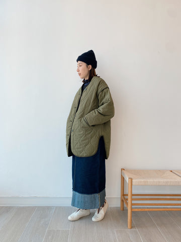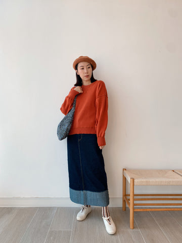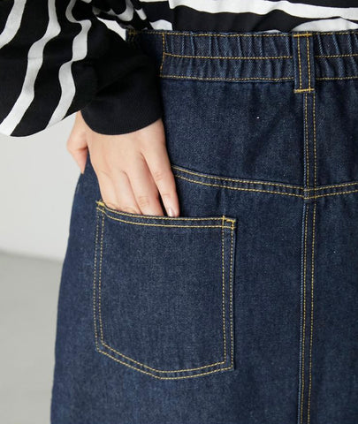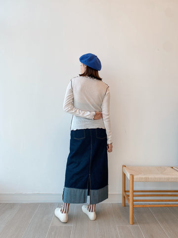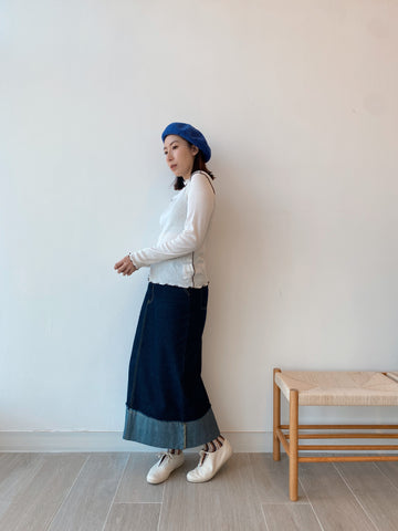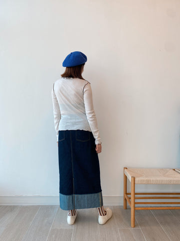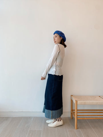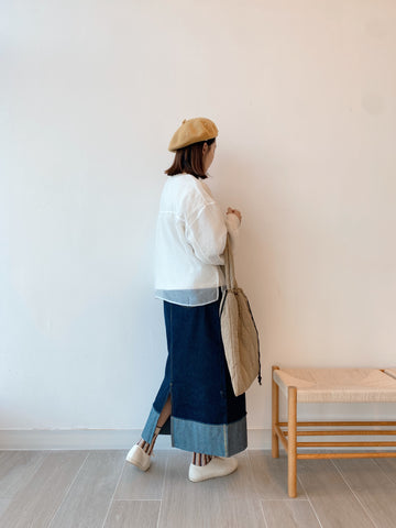 應付秋天小涼意 裙子稍稍長一點便好 牛仔色系百撘看不膩💙 是種輕盈俐落的日常穿撘 (Jessica wear Size L) M size 腰圍(平放): 64cm 坐圍: 99cm 裙長: 90.5cm L size 腰圍(平放): 66cm 坐圍: 103cm 裙長: 93cm